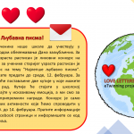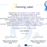 Пројекат „Љубавна писма“ је објављен у јануару ове године на порталу eTwinning. Настао је у сарадњи наших запослених. Пројектна идеја је 16. јануара 2020. пренета у форму коју захтева портал eTwinning, а пројекат је одобрен 28. јануара. Реализоваће се од 10. до 14. фебруара кроз неколико врло занимљивих и креативних активности. У пројекту ће учествовати сви заинтересовани ученици, учитељи и наставници, као и колеге из других школа које се прикључе пројекту.